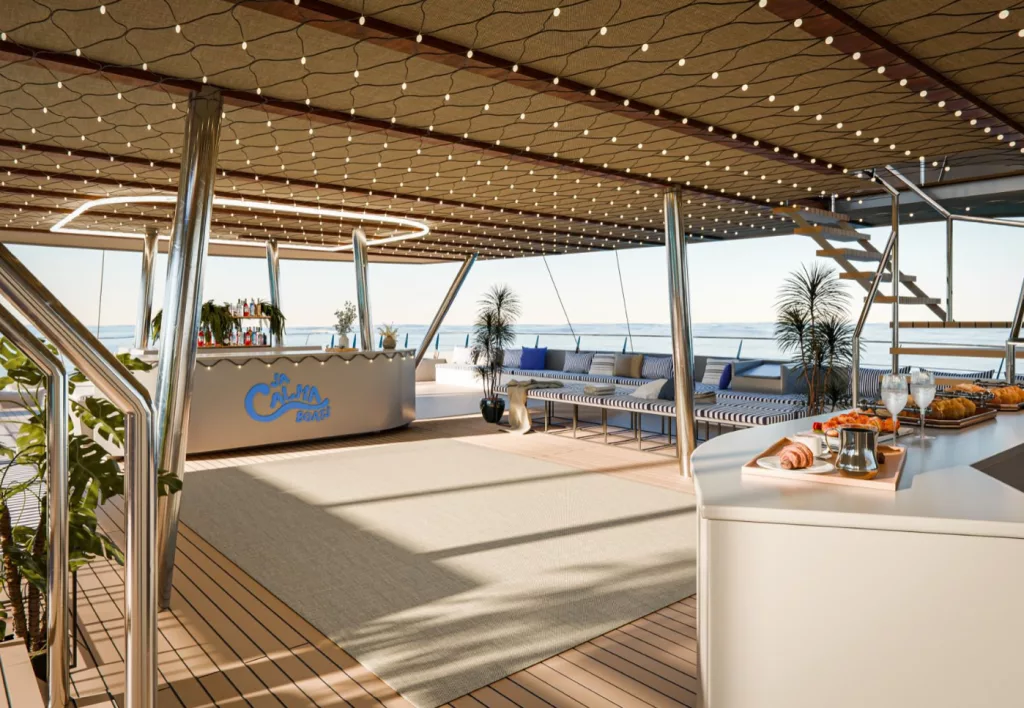 Food and beverage service is conceived as a key part of the onboard experience. Guests have access to multiple bars and clearly defined service areas, offering drinks and catering options adapted to each zone. Premium catering is available in selected areas, while standard catering ensures quality and consistency throughout the catamaran, creating a relaxed and social atmosphere during the excursion.